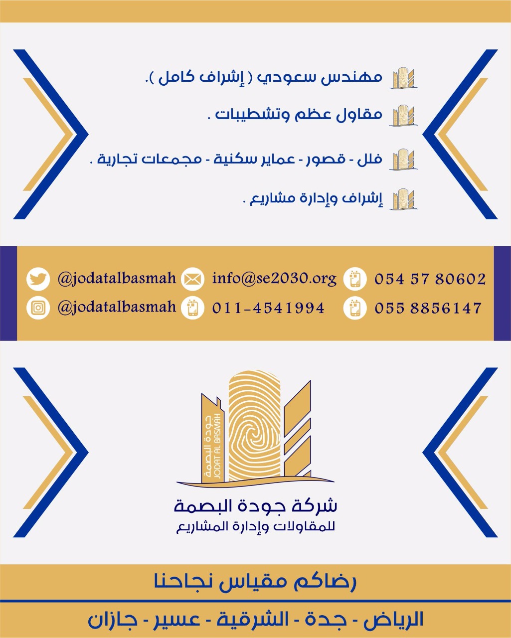 بدأت فكرة جودة البصمة بعد دراسة واسعة لقطاع المقاولات في المملكة والحاجة لرفع مستوى الجودة وايقاف الهدر الحقيقي للمال والمواد والمساعدة في تخفيف الكثير من الخسائر والغش التجاري في البناء وتنبيه المواطن وتنويره بما يخص البناء , وبحكم الحراك العمراني الذي تشهده المملكة، وانطلاقاً من واجبنا المهني والوطني ازددنا إصراراً على أن تكون جودة البصمة رائدة في مجالها , وتم تأسيسها وفقاً لمعايير الجودة الحديثة ورؤية طموحة وأهداف سامية وقيم ومبادئ راسخة حتى أصبحت في وقت وجيز شركة متميزة ولله الحمد.